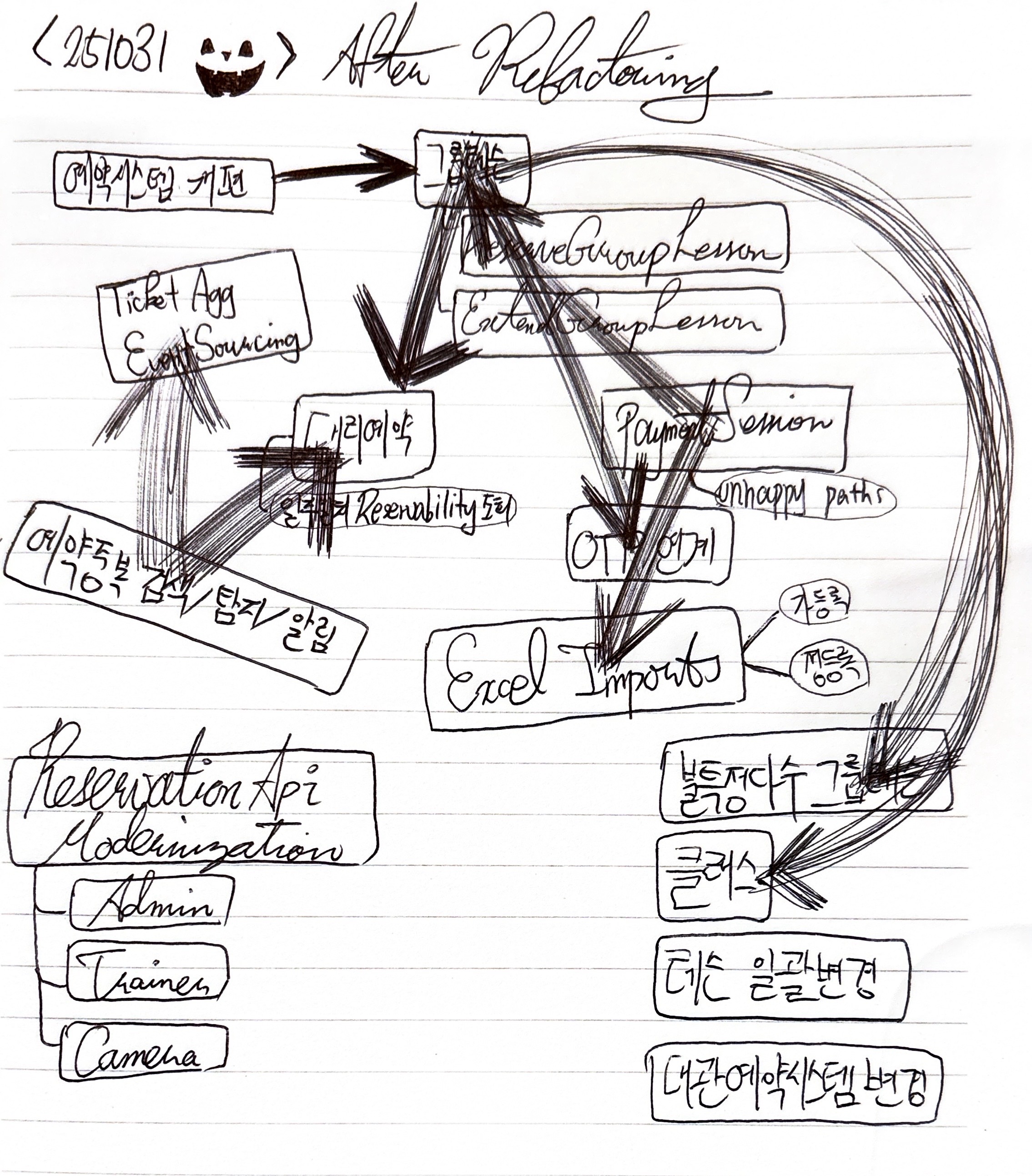 | 2025-10-11 | 낮에는 뛰고 걷고 요가하고 저녁에는 부족했던 연휴 업무계획을 보충한다. 토/일 이틀간 달성해야 할 목표는 다음과 같다: 1. TicketHistory 상태전이에 대한 커맨드 & 이벤트를 나열한다. 2. ProvisionalReservation 상태를 식별한다. 3. ProvisionalReservation 상태전이에 대한 커맨드 & 이벤트를 나열한다. 4. TicketHistoryAggregate를 구현한다. 5. 기존에 TicketHistory에 의존하던 모든 코드를 TicketHistoryAggregate를 사용하는 방향으로 리팩터링한다. |